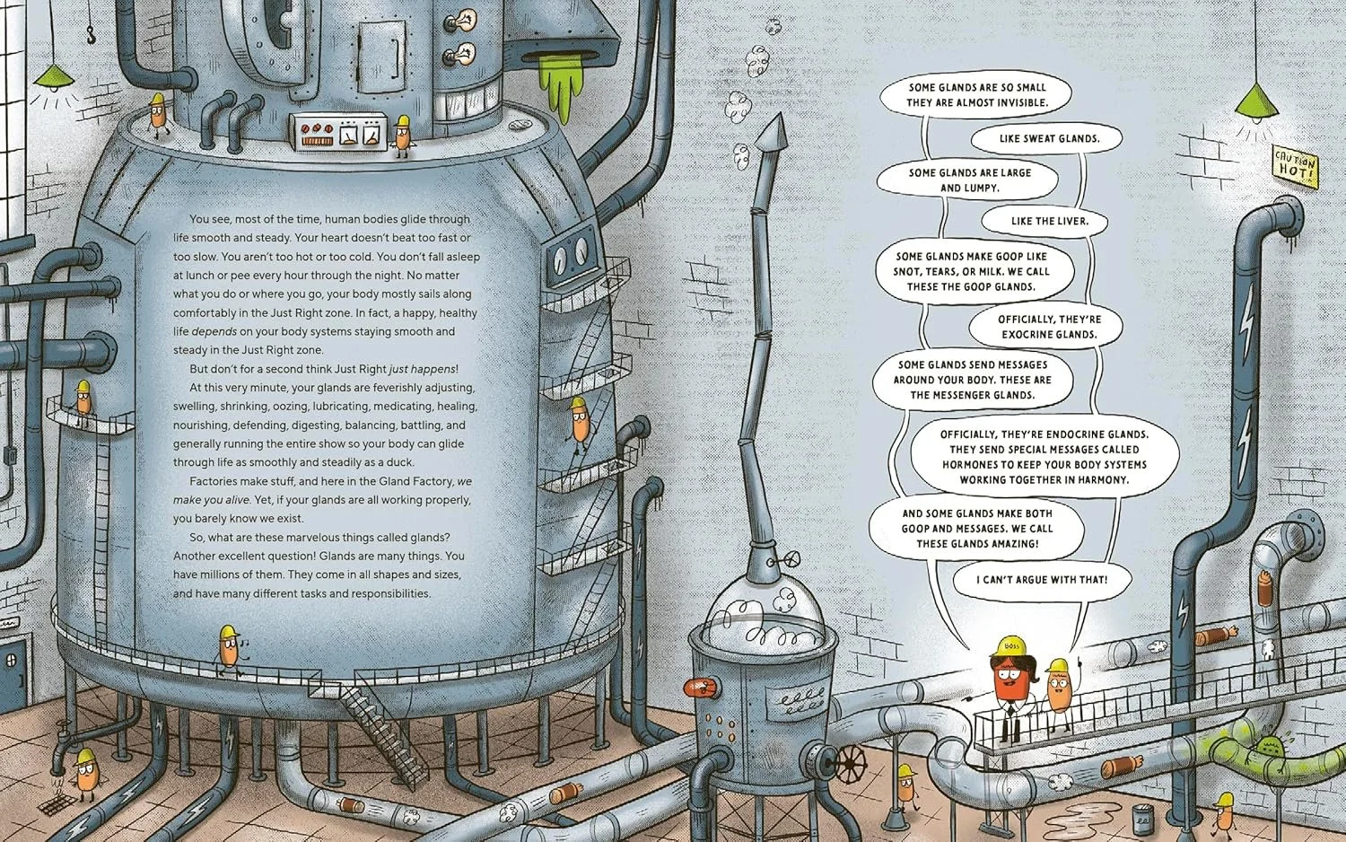 In The Gland Factory, you’ll get an up-close look at your endocrine and exocrine systems, where glands are feverishly swelling, shrinking, oozing, healing, digesting, and maintaining balance. Extensive backmatter includes a suggested further reading list, a “Gland Factory Survey” and a detailed glossary of all the wonderfully gross glands explored.